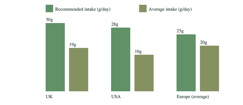 UK adults are advised to consume 30 grams of fibre per day, yet average intake is closer to 18–20 grams. In the USA, actual average intake among US adults is about 15–16 grams per day, roughly half of the recommended level. This pattern - recommended intakes in the mid-20s to 30s gram range with actual consumption significantly lower - is typical across many high-income countries.