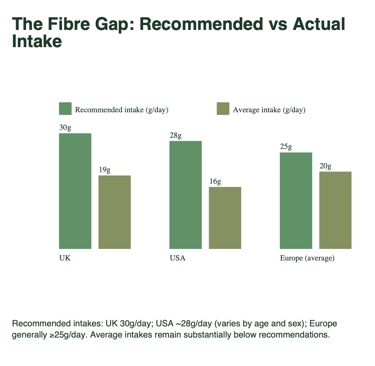 Fibre is an essential part of a healthy diet. It plays a central role in digestive health and is strongly linked to a lower risk of several chronic diseases. Yet most adults in the UK, USA and Europe do not meet the recommended intake of 30 grams per day (which is already a low target).