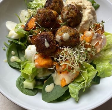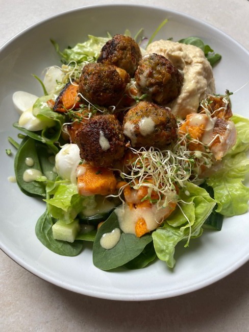 Creamy lemon & tahini dressing – whisk together a tablespoon of tahini, a tablespoon of lemon juice, two tablespoons of water, a teaspoon of maple syrup and a pinch of seasalt