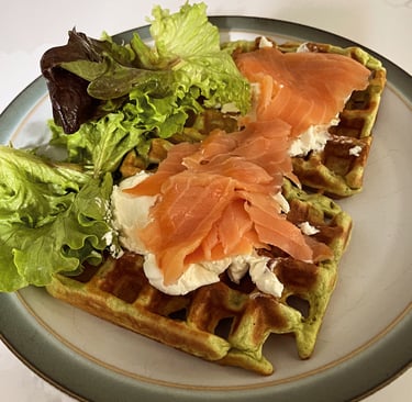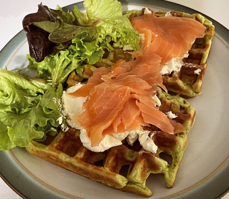 These savoury waffles are easy to make and are perfect for a lazy weekend brunch. Top with anything you like. Cream cheese and local smoked trout is a favourite in our house.